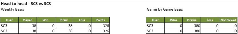 This was a train wreck of a week. Supercomputer 1 managed to correctly identify one result which not much worse than my attempt to get more than 2 results. I’ll have to look at records but I am fairly confident that this is a weekly total aggregate low score record. The Watford game accounted for roughly over one-third of the total points!